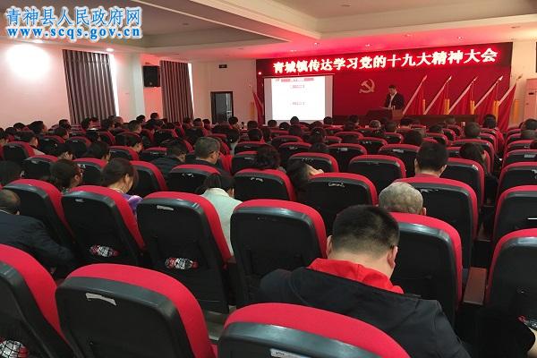 2017年11月9日,青城镇在四楼会议室组织召开了传达学习党的十九大精神大会,镇长刘永生主持会议,全体镇干部、各村(社区)四(五)职、村(社区)纪检员、下属党支部书记共计180余人参会。