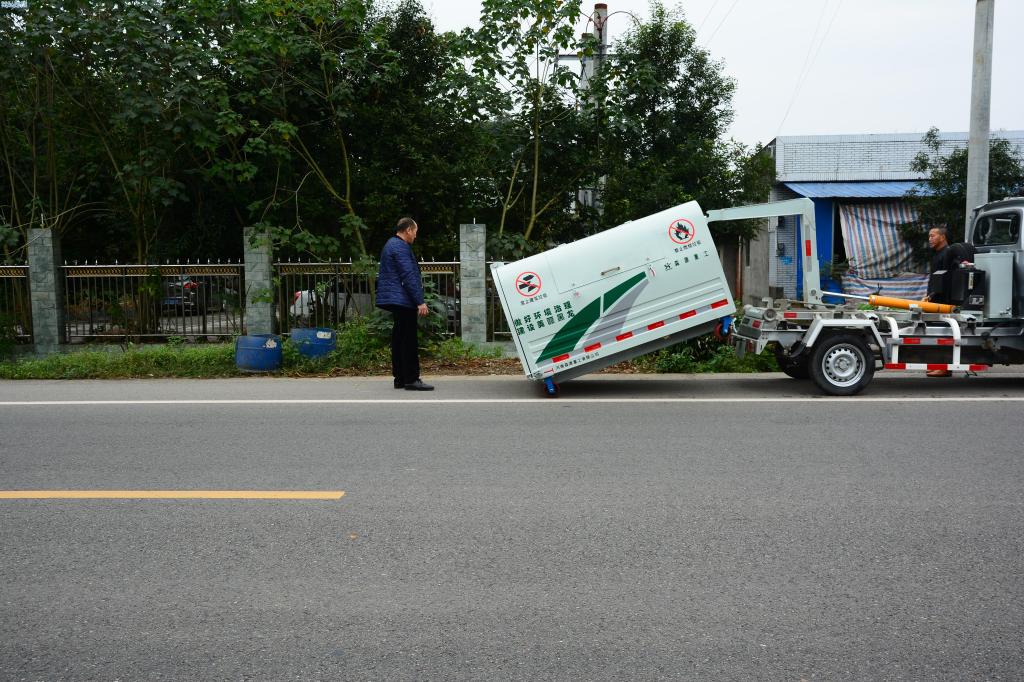 2017年11月20日下午,黑龙镇整治办工作人员正沿着眉青路摆放垃圾箱,工作人员介绍到:“这个垃圾箱全封闭、可移动,能装生活垃圾约0.6吨,采用机械拖卸,既节约人工,又能避免垃圾散落、气味传出,比垃圾池更能让群众接受,更环保卫生。”