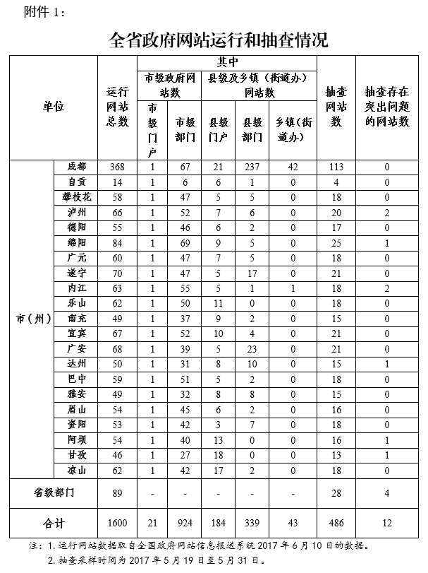 (一)抽查总体情况。第二季度,省政府办公厅从全省处于正常运行状态的1600家政府网站中随机抽查了486个网站,占全省政府网站运行总数的30.4%,总体合格率97.5%。除泸州、绵阳、内江、达州、阿坝、甘孜等6个市(州)外,其余15个市(州)抽查合格率为100%。