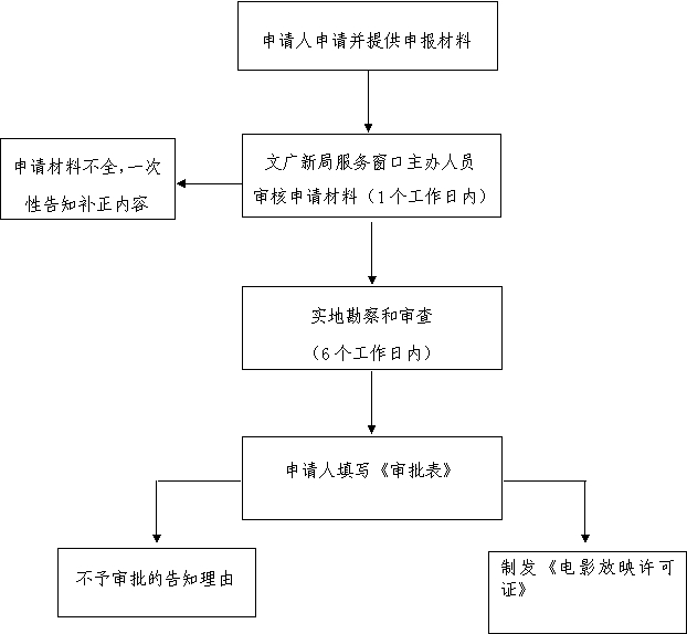 国务院《电影管理条例》(国务院令第342号)第三十八条:设立电影放映单位,应当向所在地县或者设区的市人民政府电影行政部门提出申请。所在地县或者设区的市人民政府电影行政部门应当自收到申请书之日起60日内作出批准或者不批准的决定,并通知申请人。批准的,发给《电影放映经营许可证》,不批准的,应当说明理由。