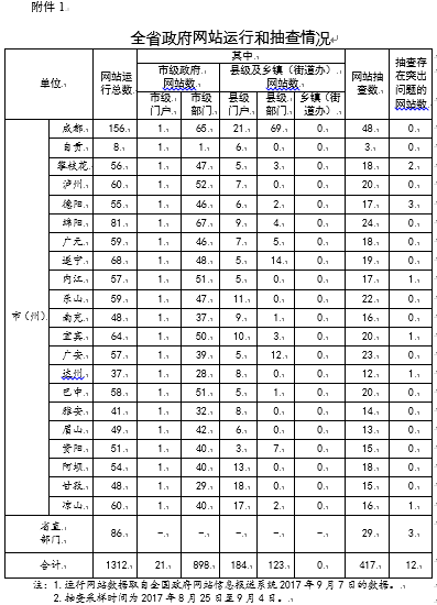 (一)全省政府网站抽查情况。截至2017年9月7日,全省正在运行的政府网站1312个。其中,省直部门网站86个,市级政府门户网站21个,市级部门网站898个,县级政府门户网站184个,县级部门网站123个。省政府办公厅组织随机抽查并人工复核417个,总体合格率97.1%。其中,成都、甘孜等15个市(州)政府网站抽查合格率为100%;成都、遂宁、乐山、南充、广安、巴中、雅安和眉山等8个市(州)连续三个季度抽查合格率达100%。