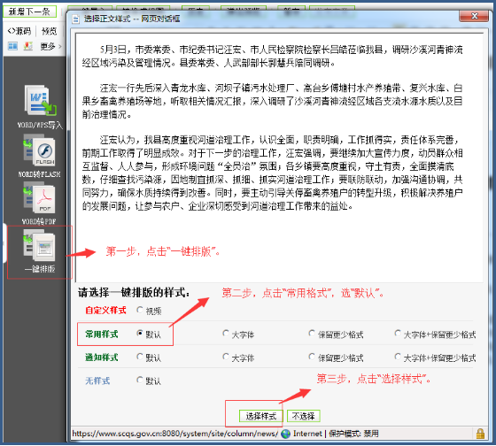 注意:最好朗读校正,一定要再三核查。并严格执行三级审核制:信息员(录入审查)——分管领导(审核)——行政首长(审发)。一经发布后文章即上互联网,一出错会影响青神县人民政府形象。